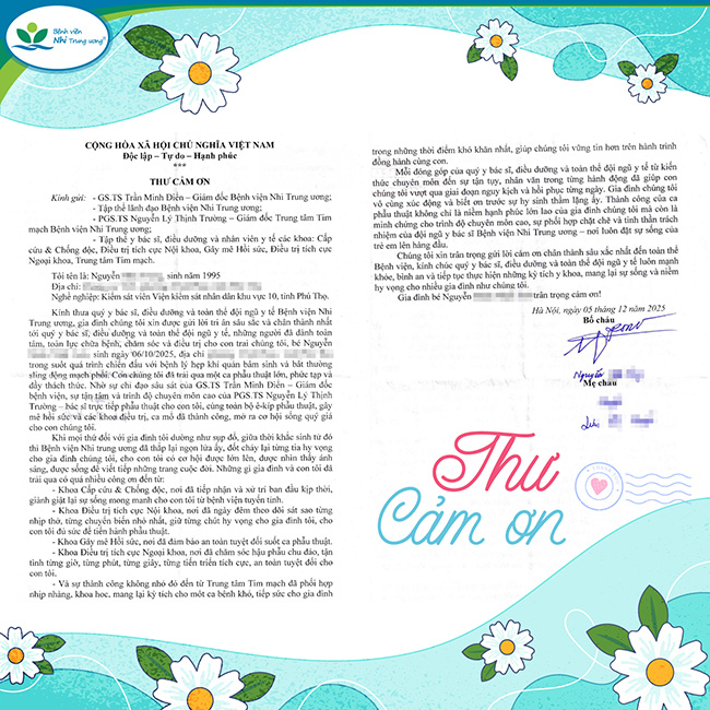 Trong lá thư cảm ơn gửi tới Bệnh viện, gia đình bé bày tỏ lòng tri ân sâu sắc tới GS.TS Trần Minh Điển – Giám đốc Bệnh viện cùng Ban lãnh đạo Bệnh viện, PGS.TS Nguyễn Lý Thịnh Trường, cùng tập thể y bác sĩ các đơn vị: Trung tâm Tim mạch, Khoa Cấp cứu và Chống độc, Khoa Điều trị tích cực Nội khoa, Khoa Gây mê Hồi sức, Khoa Điều trị tích cực Ngoại khoa và Trung tâm Tim mạch – những người đã theo sát từng diễn biến, xử trí kịp thời và nỗ lực hết mình để giành lại sự sống cho bé.