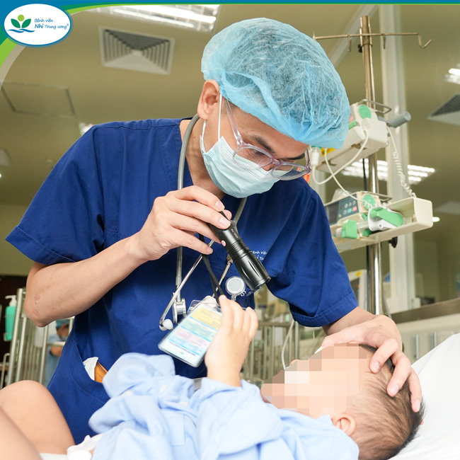 ThS.BS Nguyễn Đức Thường – Phó Trưởng khoa Điều trị tích cực Ngoại khoa thăm khám cho trẻ