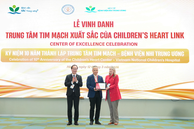 Nhân dịp kỷ niệm 10 năm thành lập, Trung tâm Tim mạch – Bệnh viện Nhi Trung ương đã vinh dự được Children’s HeartLink – tổ chức phi lợi nhuận quốc tế trụ sở tại Hoa Kỳ, hoạt động nhằm cải thiện chất lượng chăm sóc cho trẻ em mắc bệnh tim bẩm sinh ở các khu vực thiếu dịch vụ chuyên sâu trên thế giới, trao tặng danh hiệu “Trung tâm Tim mạch xuất sắc”. Lễ vinh danh diễn ra trong khuôn khổ Hội nghị khoa học “Cập nhật kinh nghiệm chẩn đoán và điều trị tim bẩm sinh phức tạp”, do bệnh viện phối hợp với Hội Nhi khoa Việt Nam tổ chức trong hai ngày 12–13/3/2026.