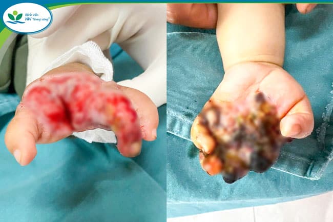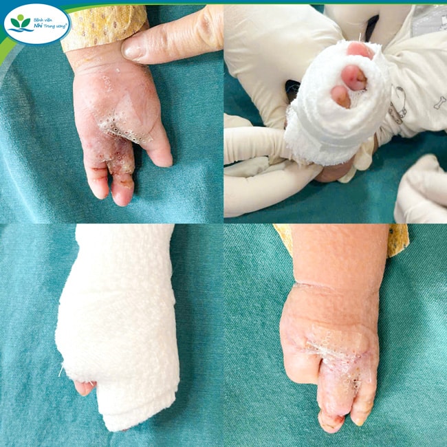 Bàn tay trẻ tại thời điểm nhập viện và sau khi phẫu thuật
