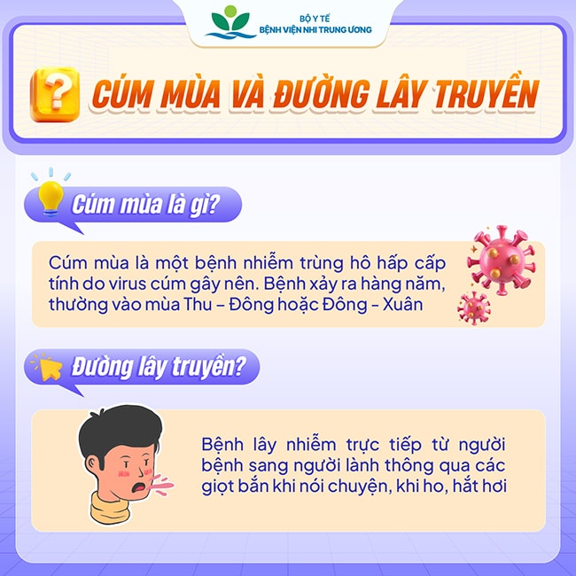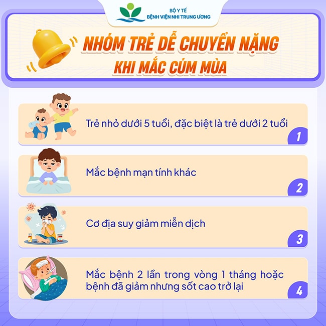 Cúm mùa là bệnh truyền nhiễm do virus cúm gây ra với tốc độ lây lan nhanh và có thể dẫn đến nhiều biến chứng nguy hiểm nếu không được phát hiện và điều trị kịp thời. Do đó cha mẹ cần đặc biệt lưu ý nhóm trẻ dễ tiến triển nặng, các dấu hiệu nguy hiểm cần phải đưa trẻ đến bệnh viện ngay và biết cách chăm sóc trẻ tại nhà đối với trường hợp bệnh nhẹ: