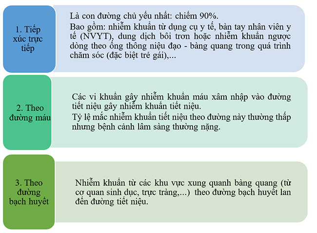 II. Các đường lây truyền dẫn đến nhiễm khuẩn tiết niệu ở người bệnh có đặt ống thông niệu đạo – bàng quang