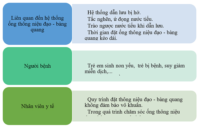 3. Nhiễm trùng đường tiết niệu liên quan đến ống thông niệu đạo – bàng quang (Catheter Associated Urinary Tract Infection – CAUTI) là nhiễm khuẩn đường tiết niệu xảy ra sau khi thực hành đặt và lưu ống thông niệu đạo – bàng quang ≥ 2 ngày. Đây là một trong những loại nhiễm trùng phổ biến liên quan đến chăm sóc y tế. Mỗi ngày ống thông niệu đạo – bàng quang được lưu, nguy cơ mắc CAUTI sẽ tăng 3-7%. CAUTI có thể gây nên những biến chứng nghiêm trọng, gây khó chịu cho người bệnh (NB), kéo dài thời gian nằm viện, tăng chi phí cũng như tỷ lệ tử vong.