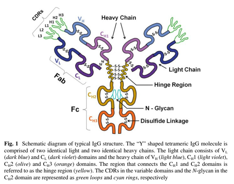 Kháng thể có bản chất là các chuỗi protein, bao gồm một chuỗi nặng và một chuỗi nhẹ nối với nhau bằng cầu nối disulfat tạo thành cấu trúc hình chữ Y. Về cấu trúc, vùng kết hợp với kháng nguyên (CDR) nằm trong đoạn liên kết kháng nguyên (Fab) của mAbs là vị trí kháng thể (paratope) gắn với epitope của kháng nguyên. Vị trí gắn này đặc trưng cho từng mAbs, tạo nên tính đặc hiệu đích cao và hạn chế tác dụng không mong muốn. Đoạn cố định (Fc) của mAbs thể hiện tác dụng thông qua khả năng liên kết với thụ thể gamma Fc (FcγR) trên bề mặt các tế bào 1,2.
