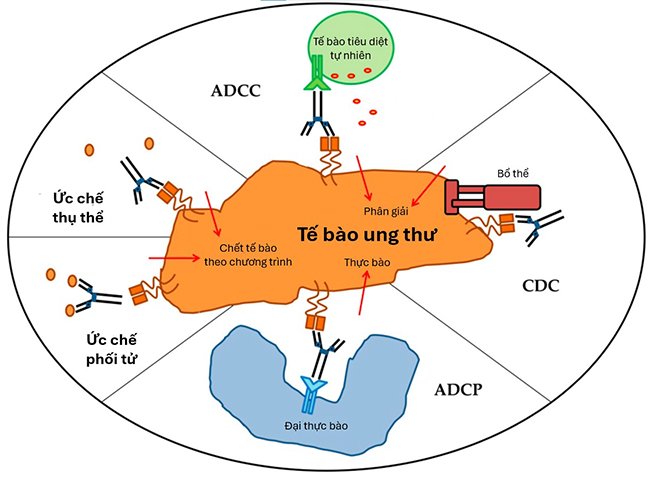 Hình 2. Cơ chế tiêu diệt tế bào ung thư 4. ADCC: Độc tế bào phụ thuộc kháng thể; CDC: Độc tế bào phụ thuộc bổ thể; ADCP: Thực bào phụ thuộc kháng thể.