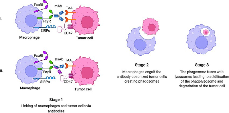 Kháng thể đơn dòng IgG1 hoặc IgG3 có thể đánh dấu tế bào ung thư bằng cách tạo thành phức hợp kháng nguyên – kháng thể với các kháng nguyên đặc trưng trên bề mặt. ADCP xảy ra khi FcγRI trên bề mặt đại thực bào gắn với tế bào ung thư đã được đánh dấu. Hiện tại chưa có nhiều nghiên cứu về tác động của ADCP, tuy nhiên một số bằng chứng cho thấy cơ chế này đóng vai trò quan trọng trong tiêu diệt tế bào khối u lưu thông (circulating tumour cells – CTC) gây ra sự xuất hiện của tình trạng di căn 4.