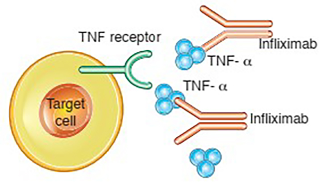 Cơ chế hoạt động của adalimumab và infliximab liên quan đến khả năng gắn kết ái lực cao với TNF-α tiết ra từ các tế bào miễn dịch. Nhờ cơ chế này, adalimumab và infliximab ức chế tình trạng viêm và các biểu hiện rối loạn do viêm liên quan đến vai trò của TNF-α. Ví dụ, trong viêm khớp, TNF tạo điều kiện cho việc kích hoạt các phối tử NF-κB trên tế bào mô đệm hoặc tế bào tạo xương, tăng sự phá hủy sụn và xương, đồng thời kích thích sự trưởng thành và hoạt hóa của tế bào hủy xương. Các tác nhân chống TNF vì vậy có vai trò quan trọng và toàn diện trong điều trị viêm khớp 11,12.
