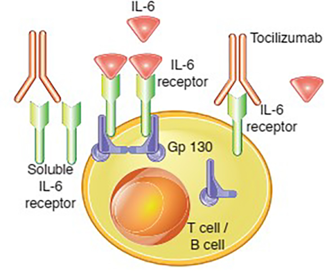 Tocilizumab là kháng thể đơn dòng liên kết chọn lọc với IL-6, từ đó ngăn IL-6 liên kết với thụ thể của nó trên gan, phổi và nguyên bào sợi hoạt dịch. Việc ức chế phức hợp thụ thể làm ngăn chặn sự truyền tín hiệu đến các chất trung gian hóa học thu hút tế bào B và T, từ đó giảm tình trạng viêm mạn tính liên quan đến IL-6 13.