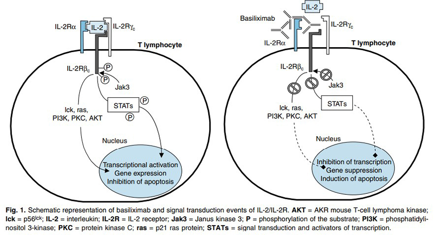 Basiliximab là kháng thể đơn dòng có nguồn gốc người/chuột có tác dụng ức chế chuỗi α của thụ thể IL-2 (kháng nguyên CD25) biểu hiện trên bề mặt tế bào lympho T. Theo các nghiên cứu, IL-2 và thụ thể của nó đóng vai trò trung tâm trong hoạt hóa tế bào lympho T và phản ứng miễn dịch sau cấy ghép 14.