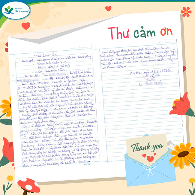 Hôm nay, Bệnh viện xin chia sẻ bức thư đầy xúc động mà bố bé gửi tới Ban Giám đốc Bệnh viện, Khoa Nội Thần kinh, Phòng Công tác xã hội và các nhà hảo tâm. Những dòng chữ giản dị ấy là lời tri ân chân thành gửi tới đội ngũ bác sĩ, điều dưỡng, nhân viên y tế đã tận tâm đồng hành trong suốt quá trình điều trị, đồng thời trân trọng cảm ơn sự sẻ chia kịp thời của cộng đồng – điểm tựa giúp bé và gia đình vững tin trên hành trình hồi phục.