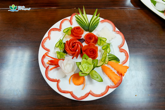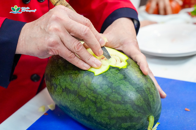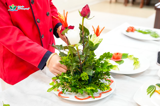 Giảng viên tận tâm hướng dẫn kỹ thuật cắt tỉa, trang trí mâm cơm Tết cổ truyền tại buổi tập huấn
