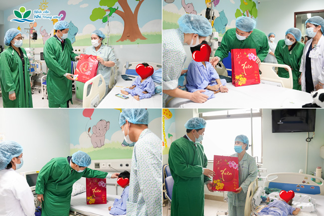 Đoàn công tác đã đến từng giường bệnh, ân cần thăm hỏi và tặng quà Tết cho các bệnh nhi đang điều trị tại khoa Gan mật. Thứ trưởng động viên các bé cùng gia đình an tâm chữa bệnh, đồng thời chia sẻ với những khó khăn của bệnh nhi khi xa nhà dịp Tết đến, Xuân về.