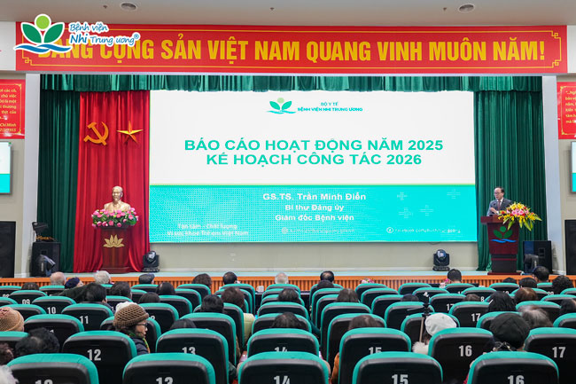 Hân hoan chào đón các cán bộ hưu trí, GS.TS Trần Minh Điển – Giám đốc Bệnh viện thay mặt Đảng ủy, Ban Giám đốc chia sẻ khái quát về tình hình hoạt động của Bệnh viện năm 2025 và định hướng phát triển trong năm 2026. Theo đó, mặc dù năm 2025 có nhiều khó khăn, áp lực chuyên môn cao, song Bệnh viện Nhi Trung ương vẫn hoàn thành tốt các nhiệm vụ được giao, duy trì hoạt động ổn định và an toàn; Giữ vững vai trò bệnh viện chuyên khoa nhi tuyến cuối, tiếp tục khẳng định năng lực chuyên môn, uy tín và vị thế trong hệ thống y tế. Những kết quả đạt được năm 2025 đã tạo nền tảng quan trọng cho giai đoạn phát triển tiếp theo, đặc biệt là việc đưa Cơ sở 2 vào hoạt động. Trên cơ sở đó, năm 2026, Bệnh viện tập trung ổn định tổ chức, nâng cao chất lượng chuyên môn, tăng cường quản lý chất lượng và vận hành hiệu quả Cơ sở 2, hướng tới phát triển bền vững và chăm sóc sức khỏe trẻ em ngày càng tốt hơn.