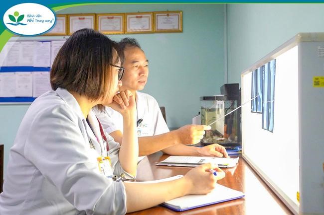 Các bác sĩ đánh giá phim chụp X-quang của trẻ trước và sau phẫu thuật