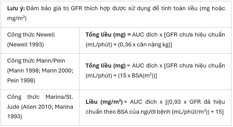 Trong đó: Liều là liều dùng (đơn vị mg); AUC đích là đích mà diện tích dưới đường cong nồng độ thời gian cần đạt, áp dụng đích khác nhau cho chỉ định khác nhau (đơn vị [mg/ml]×phút); GFR là mức lọc cầu thận (đơn vị ml/phút).