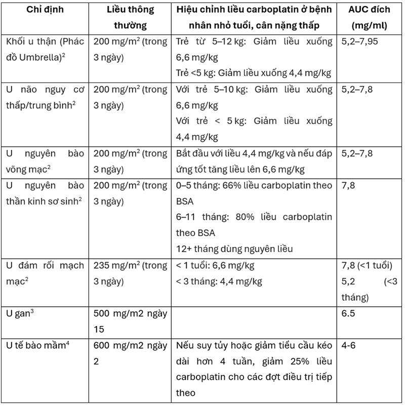 Tuỳ theo chức năng thận, liều dùng carboplatin trên bệnh nhi được hiệu chỉnh bằng các cách khác nhau1