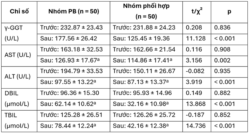 Cả hai nhóm đều có cải thiện chức năng gan và giảm bilirubin sau điều trị (p < 0.01).