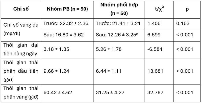 Kết quả nghiên cứu cho thấy nhóm phối hợp có cải thiện rõ rệt về chỉ số vàng da. Bên cạnh đó nhóm điều trị phối hợp có số lần đi tiêu/ngày nhiều hơn, thời gian phân chuyển màu vàng nhanh hơn (p < 0.05).