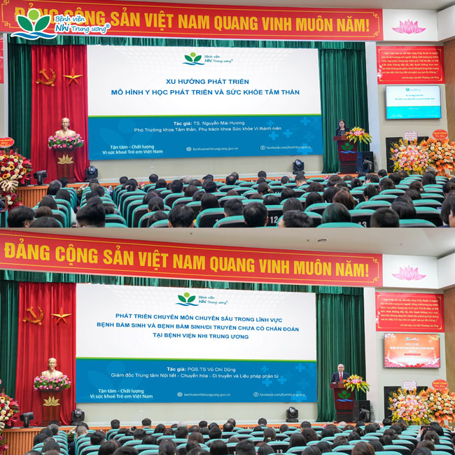 Hội nghị còn tập trung vào các mục tiêu, giải pháp nâng cao năng lực chuyên môn, chất lượng nguồn nhân lực và sự hài lòng của người bệnh, thể hiện qua các bài tham luận về các chủ đề thiết thực và chuyên sâu: Xu hướng phát triển mô hình y học phát triển và sức khỏe tâm thần – TS. Nguyễn Mai Hương, Phó trưởng khoa Tâm thần, Phụ trách khoa Sức khỏe Vị thành niên; Phát triển chuyên môn chuyên sâu trong lĩnh vực bệnh bẩm sinh và bệnh bẩm sinh/di truyền chưa có chẩn đoán tại Bệnh viện Nhi Trung ương – PGS.TS Vũ Chí Dũng, Giám đốc Trung tâm Nội tiết – Chuyển hóa – Di truyền và Liệu pháp phân tử.