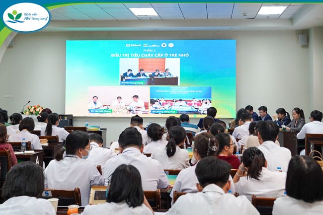 Các chuyên gia đến từ ba bệnh viện tham gia hội thảo thông qua hình thức trực tiếp và trực tuyếnnhằm cập nhật thực hành lâm sàng trong điều trị bệnh lý tiêu hóa và hô hấp ở trẻ em
