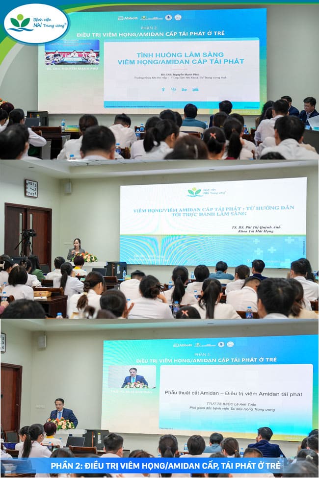 Tại hội thảo, các báo cáo viên trình bày các chủ đề chuyên môn trọng tâm như: đặc điểm tiêu chảy cấp ở trẻ dưới 2 tuổi, tác nhân thường gặp và lựa chọn phác đồ điều trị tối ưu; phân tích các tình huống lâm sàng; quản lý tiêu chảy tái diễn; chẩn đoán và điều trị viêm họng, viêm amidan cấp tái phát; quản lý trẻ tái phát sau cắt amidan; cùng các cập nhật hướng dẫn điều trị theo cơ chế bệnh sinh. Những kinh nghiệm thực tiễn từ các bệnh viện cũng được chia sẻ, góp phần làm rõ các thách thức trong chăm sóc và điều trị hiện nay.
