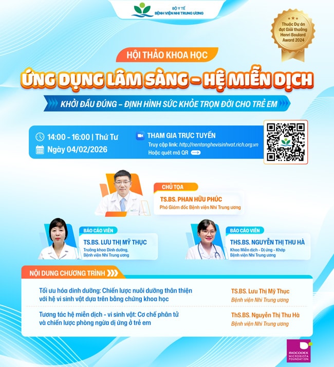 Viện Đào tạo và Nghiên cứu Sức khỏe Trẻ em – Bệnh viện Nhi Trung ương xin trân trọng thông báo và kính mời các cán bộ, nhân viên y tế tham dự Hội thảo khoa học trực tuyến: Ứng dụng lâm sàng – hệ miễn dịch: Khởi đầu đúng – Định hình sức khỏe trọn đời cho trẻ em.
