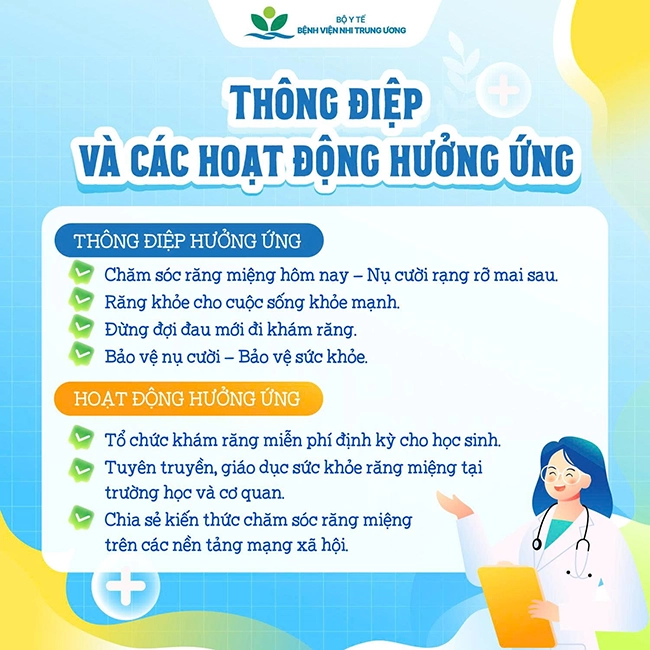 - Chương trình nha học đường: giáo dục sức khỏe răng miệng, súc miệng Fluor, khám sàng lọc, trám bít dự phòng sâu răng.