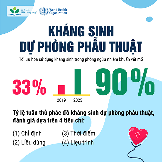 Tại Bệnh viện Nhi Trung ương, trong khuôn khổ Chương trình Quản lý Sử dụng kháng sinh, từ năm 2019, hoạt động khảo sát, đánh giá sử dụng KSDPPT đã chính thức được triển khai thường quy tại 06 khoa lâm sàng thuộc khối ngoại bao gồm Ngoại Tiết niệu, Sọ mặt & Tạo hình, Chỉnh hình, Ngoại Tiêu hoá, Ngoại Lồng ngực và Ngoại Gan-Mật-Tuỵ. Nhiều chuyển biến tích cực đã được ghi nhận, khi tỷ lệ tuân thủ phác đồ KSDPPT tại Bệnh viện xét chung dựa trên 4 tiêu chí đã tăng từ 33% lên 90%.