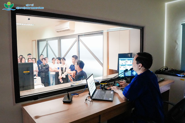 Giảng viên theo dõi và đánh giá học viên thực hành qua kính quan sát trong các tình huống mô phỏng lâm sàng, giúp đảm bảo tính chính xác và khách quan trong quá trình đào tạo