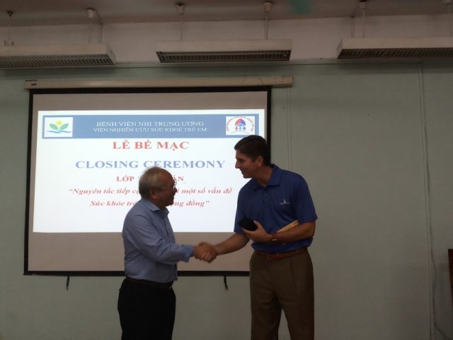 Kết thúc hai ngày làm việc tại Bệnh viện Nhi Trung ương, GS. Lê Thanh Hải – Giám đốc Bệnh viện đã tới tham dự lễ trao chứng nhận khóa học cho các bác sĩ và gửi lời cảm ơn trân trọng tới Tiến sĩ Christopher King. Trong phát biểu của mình, GS Lê Thanh Hải khẳng định lại một lần nữa vai trò, tầm quan trọng của chăm sóc sức khỏe ban đầu trong chăm sóc y tế. . Theo GS Lê Thanh Hải, hướng đi tương lai của Bệnh viện đó là bao phủ rộng rãi chăm sóc sức khỏe tới khu vực miền Bắc, miền Trung, vùng sâu, vùng xa với phương châm “Nếu bệnh nhân không thể đến với chúng ta thì chúng ta đến với bệnh nhân”.