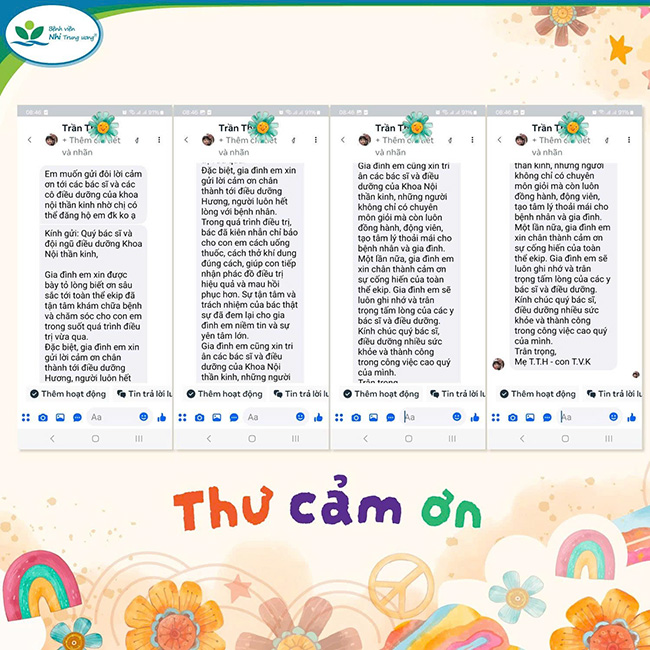 Đặc biệt, gia đình em xin gửi lời cảm ơn chân thành tới điều dưỡng Hương, người luôn hết lòng với bệnh nhân. Trong quá trình điều trị, bác đã kiên nhẫn chỉ bảo cho con em cách uống thuốc, cách thở khí dung đúng cách, giúp con tiếp nhận phác đồ điều trị hiệu quả và mau hồi phục hơn. Sự tận tâm và trách nhiệm của bác thật sự đã đem lại cho gia đình em niềm tin và sự yên tâm lớn.