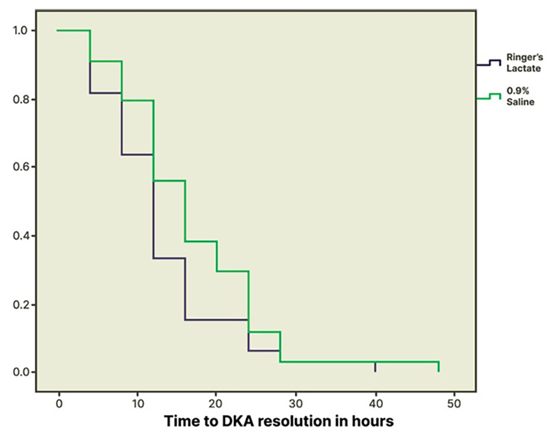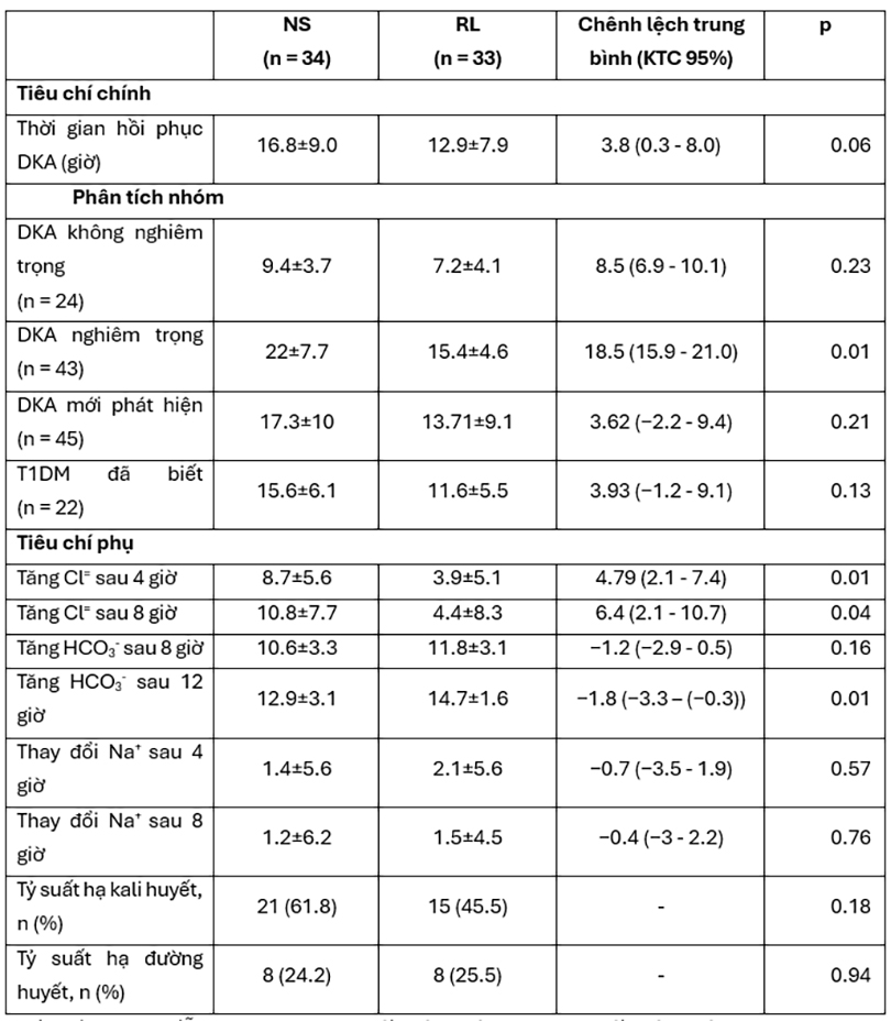 Bình luận của biên tập viên: Kết quả nghiên cứu cho thấy tiềm năng rút ngắn thời gian hồi phục DKA khi sử dụng RL so với NS, tuy nhiên với p = 0.06, kết quả không khác biệt có ý nghĩa thống kê. Điều này có thể lý giải do quy mô mẫu chưa đủ lớn, chỉ có 67 bệnh nhân được đưa vào phân tích. Vì vậy, việc thực hiện các nghiên cứu tương tự với cỡ mẫu lớn hơn và nhóm bệnh nhân đa dạng hơn là cẩn thiết để áp dụng được kết quả này vào thực hành lâm sàng.