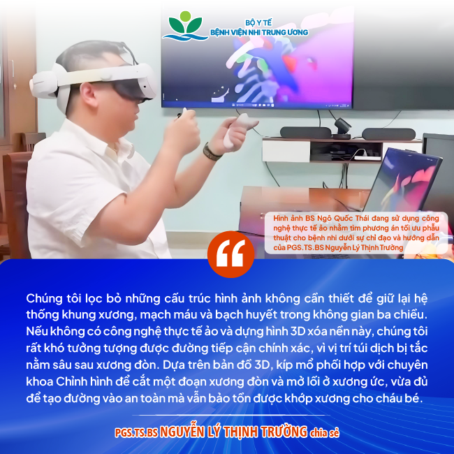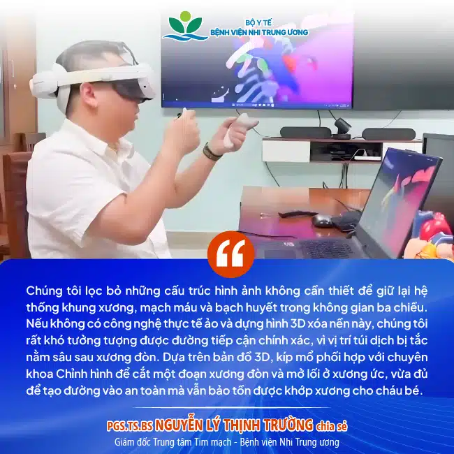 Trước khi nhận lời cho ca phẫu thuật đầy thách thức và chưa từng có tiền lệ, PGS.TS.BS Nguyễn Lý Thịnh Trường cùng một số bác sĩ trong Trung tâm Tim mạch đã mất gần 2 tuần nghiên cứu, nhằm đưa ra phương án tối ưu nhất. Vị trí cần can thiệp nằm khuất hoàn toàn phía sau xương ức và xương đòn, nơi tập trung nhiều mạch máu lớn sát cuống tim. Để tiếp cận vùng tắc nghẽn này mà không gây ảnh hưởng cấu trúc xương của trẻ, ekip phẫu thuật đã ứng dụng công nghệ thực tế ảo, dựng hình 3D xóa nền để nhìn rõ tổn thương và cấu trúc xung quanh từ dữ liệu chụp cộng hưởng từ và cắt lớp vi tính; đồng thời vạch ra nhiều kế hoạch, từ đó lựa chọn cách tiếp cận tối ưu cho phẫu thuật mà ít ảnh hưởng nhất tới an toàn của bệnh nhi. TS.BS Hoàng Hải Đức – Trưởng khoa Chỉnh hình cũng tham gia ca phẫu thuật nhằm hỗ trợ giải phóng một phần xương đòn phải, giúp tạo một phần trong hai đường vào tiếp cận tổn thương, cùng đường mở xương ức do ekip phẫu thuật tim mạch thực hiện.