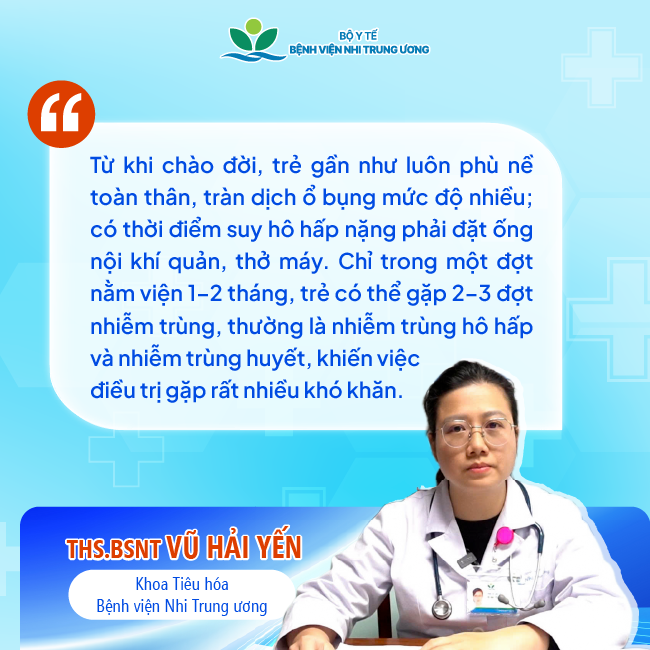 Trong điều kiện bình thường, dưỡng chấp (dịch chứa chất béo, protein và các thành phần miễn dịch) được hấp thu từ ruột non, sẽ lưu thông trong hệ bạch mạch và đổ vào tuần hoàn tĩnh mạch. Tuy nhiên, ở bệnh nhi này, do tắc nghẽn và bất thường cấu trúc hệ bạch huyết, dưỡng chấp bị rò rỉ và ứ đọng trong khoang bụng, dẫn đến cơ thể suy kiệt trầm trọng, suy giảm miễn dịch, thường xuyên nhiễm trùng do thiếu hụt Albumin và các chất đề kháng. Đồng thời, trẻ phù nề nặng toàn thân, bụng trướng to gây chèn ép cơ hoành và đường thở, dẫn đến suy hô hấp.