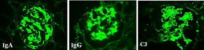 Hình ảnh lắng đọng miễn dịch trên nhuộm miễn dịch huỳnh quang trong bệnh viêm thận Lupus.