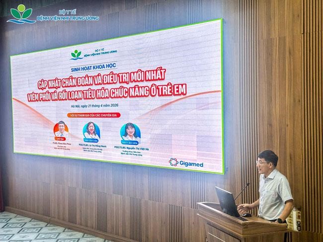 Ngày 21/04/2026 vừa qua, Bệnh viện Nhi Trung ương đã tổ chức buổi sinh hoạt khoa học trực tiếp và trực tuyến với chủ đề: “Cập nhật chẩn đoán, điều trị mới nhất viêm phổi và rối loạn tiêu hóa chức năng ở trẻ em’’. Chương trình là dịp để đội ngũ y bác sĩ cùng cập nhật những tiến bộ mới nhất, đồng thời tạo diễn đàn trao đổi kinh nghiệm thực tiễn trong chẩn đoán, điều trị, góp phần nâng cao chất lượng chăm sóc và điều trị các bệnh lý thường gặp ở trẻ em.