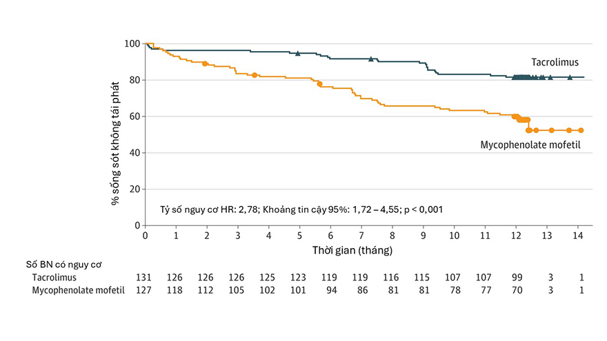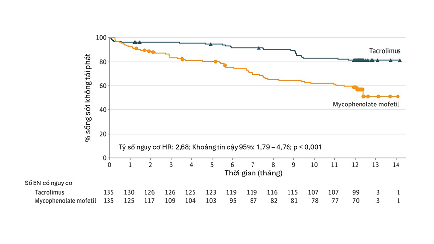 Kết quả phân tích tiêu chí chính cho thấy khả năng bệnh nhân sống sót không tái phát ở nhóm bệnh nhân dùng TAC cao hơn so với nhóm sử dụng MMF với HR 2,68; 95%CI 1,79-4,76.