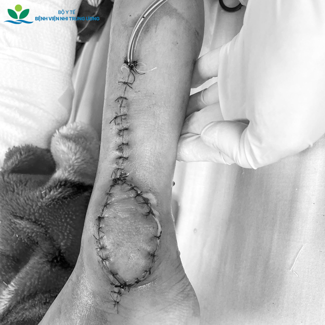 Sau mổ, trẻ hồi phục tốt, vạt da hồng ấm, xương ghép định hình đúng giải phẫu, hai chi được tưới máu ổn định, vận động cảm giác các ngón chân tốt. Điều đó cho thấy các cấu trúc quan trọng đã được bảo tồn thành công.