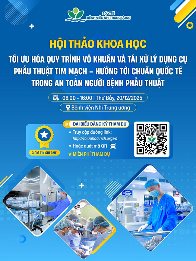 Viện Đào tạo và Nghiên cứu Sức khỏe Trẻ em – Bệnh viện Nhi Trung ương xin trân trọng thông báo và kính mời các cán bộ, nhân viên y tế tham dự Hội thảo khoa học: Tối ưu hóa quy trình vô khuẩn và tái xử lý dụng cụ phẫu thuật tim mạch – Hướng tới chuẩn quốc tế trong an toàn người bệnh phẫu thuật.