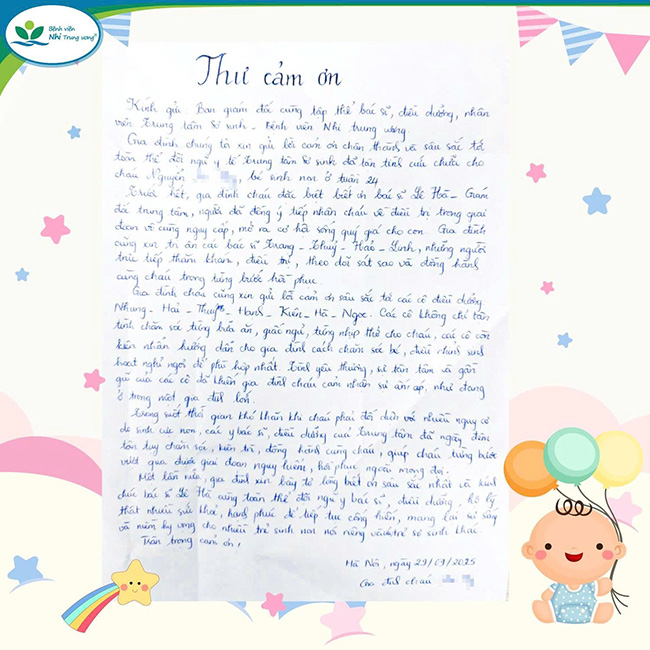 Trong bức thư gửi tới Trung tâm, gia đình bé đã bày tỏ lòng biết ơn sâu sắc tới tập thể y, bác sĩ – những người không chỉ mang đến cơ hội sống mà còn trao gửi tình thương, niềm tin và hy vọng cho gia đình.