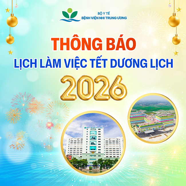 Bệnh viện Nhi Trung ương xin trân trọng thông báo lịch làm việc trong dịp nghỉ Tết Dương lịch 2026 để Quý phụ huynh và gia đình có thể sắp xếp thời gian thuận lợi nhất cho việc khám, chữa bệnh cho trẻ.
