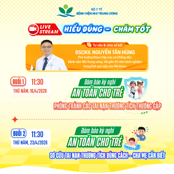 - [Livestream 2] Chủ đề: Đảm bảo kỳ nghỉ lễ an toàn cho trẻ: Sơ cứu tai nạn thương tích đúng cách – Cha mẹ cần biết (11h30 Thứ Năm, ngày 23/4/2026)