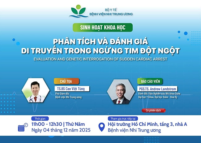 Viện Đào tạo và Nghiên cứu Sức khỏe Trẻ em, Bệnh viện Nhi Trung ương xin trân trọng thông báo và kính mời các cán bộ, nhân viên y tế tham dự buổi sinh hoạt khoa học: Phân tích và đánh giá di truyền trong ngừng tim đột ngột.
