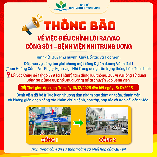 Để phục vụ công tác giải phóng mặt bằng Dự án đường Vành đai 1 (đoạn Hoàng Cầu – Voi Phục), Bệnh viện Nhi Trung ương trân trọng thông báo điều chỉnh: