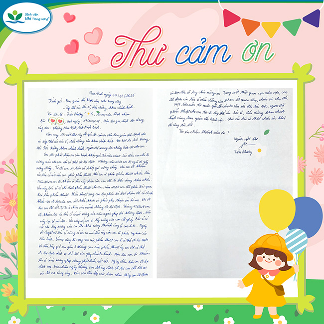 Hôm nay tôi viết thư này để gửi lời cảm ơn đến Ban Giám đốc Bệnh viện và tập thể các bác sĩ, điều dưỡng của khoa Chỉnh hình. Đặc biệt là bác Hoàng Hải Đức – Trưởng khoa Chỉnh hình, người đã mang lại những bước đi cho con. Con tôi phát hiện ra căn bệnh khớp giả từ năm 2020. Lúc đầu con chỉ bị xương mác nên con vẫn có thể đi lại được. Nhưng năm 2023 con bị ngã và gãy xương chày. Từ đó con bị luôn cả khớp giả xương chày. Khi con đi khám các bác có nói nếu con phải phẫu thuật thì con sẽ phải phẫu thuật nhiều lần. Năm 2021 con đi khám vì lúc này chân của con đã bị biến dạng khá nhiều. Lần này bác sĩ có chỉ định phẫu thuật cho con, phải trải hai lần phẫu thuật. Phẫu thuật xong con lại phải bỏ bột chân để cố định khiến việc đi lại của con rất khó khăn và phải phụ thuộc vào bố mẹ. Khi đi học con rất tự ti vì chân của mình không đi lại được. Tháng 7 năm 2025 con đi khám lại và bác sĩ có nói xương của năm ngoái ghép đã không được, lần này con sẽ mổ lại. Lần này mổ con sẽ lấy xương của con để ghép. Bác sĩ có nói nếu lấy xương của con thì khả năng thành công sẽ cao hơn. Ngày đi duyệt mổ bác sĩ cũng có nói ca mổ lần này của con sẽ phức tạp hơn các lần trước. Bố mẹ cũng hy vọng sau cuộc phẫu thuật con sẽ có thể đi lại được. Và đến bây giờ sau gần 3 tháng sau cuộc phẫu thuật ấy con đã có thể đi lại được dưới sự hỗ trợ của giày chỉnh hình. Hiện tại con đi khám bác sĩ có nói xương ghép đang phát triển rất tốt. Ngày đầu tiên con đi lại được sau bao nhiêu ngày tháng không được đi lại con đã rất vui bố mẹ cũng vậy. Khi con đến lớp các bạn nhìn thấy con đi được, các bạn đã vỗ tay chúc mừng con. Trong suốt thời gian con nằm viện, con đã được các bác sĩ điều dưỡng của khoa quan tâm, chăm sóc chu đáo.