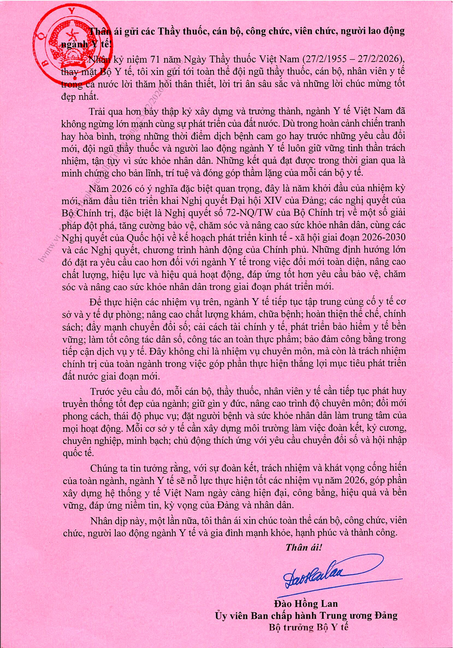 Thư của Bộ trưởng Bộ Y tế Đào Hồng Lan gửi cán bộ ngành y tế nhân Kỷ niệm 71 năm Ngày Thầy thuốc Việt Nam (27/2/1955 – 27/2/2026)