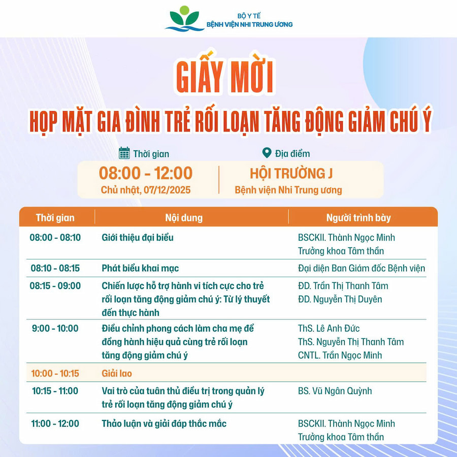 Trang chủ » Hoạt động Bệnh viện » Thư mời tham dự Buổi họp mặt gia đình trẻ rối loạn tăng động giảm chú ý ngày 07/12/2025