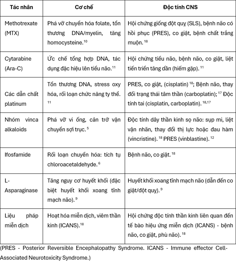 Bảng 1: Cơ chế độc tính CNS tiềm ẩn theo tác nhân hóa trị liệu chính