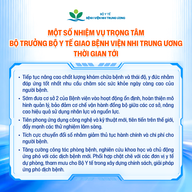 - Tiếp tục đẩy mạnh các kỹ thuật chuyên sâu; tăng cường đào tạo, nghiên cứu khoa học, đồng thời thực hiện tốt vai trò chỉ đạo tuyến, hỗ trợ chuyên môn cho hệ thống Nhi khoa toàn quốc.
