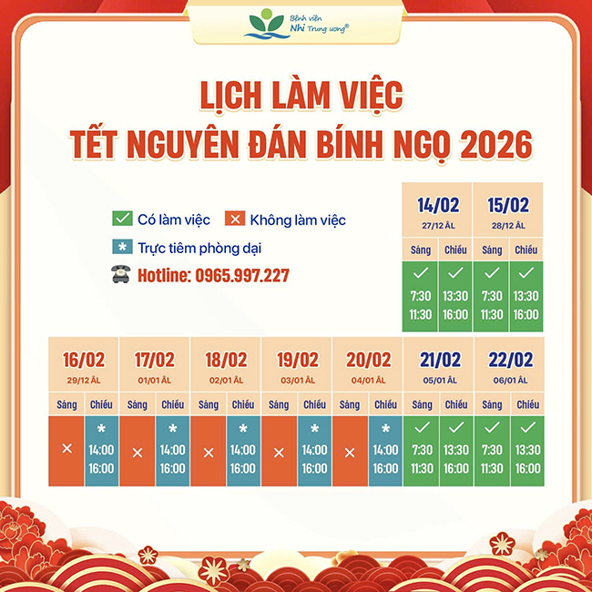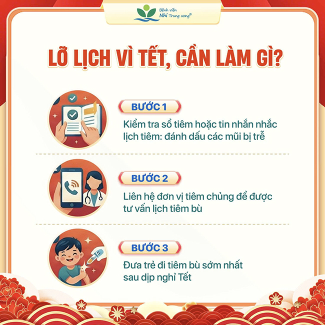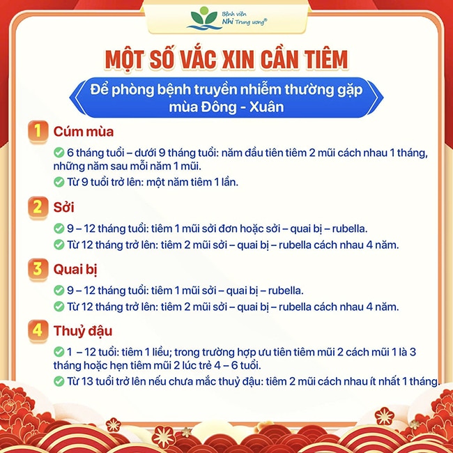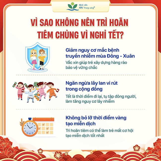 Những ngày cận Tết và trong Tết Nguyên Đán, việc đi chúc Tết, du xuân, gặp gỡ đông người tạo điều kiện thuận lợi cho các bệnh truyền nhiễm mùa Đông – Xuân lây lan nhanh chóng, thậm chí bùng phát thành dịch, đặc biệt là các bệnh lây qua đường hô hấp. Trẻ nhỏ là đối tượng rất dễ mắc bệnh do hệ miễn dịch chưa hoàn thiện. Để bảo vệ con yêu, cha mẹ cần đảm bảo trẻ được tiêm chủng đầy đủ và đúng lịch, tuyệt đối không nên trì hoãn tiêm chủng chỉ vì đi chơi, về quê hoặc sợ phiền ngày Tết.